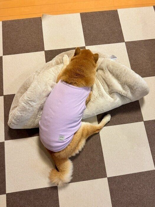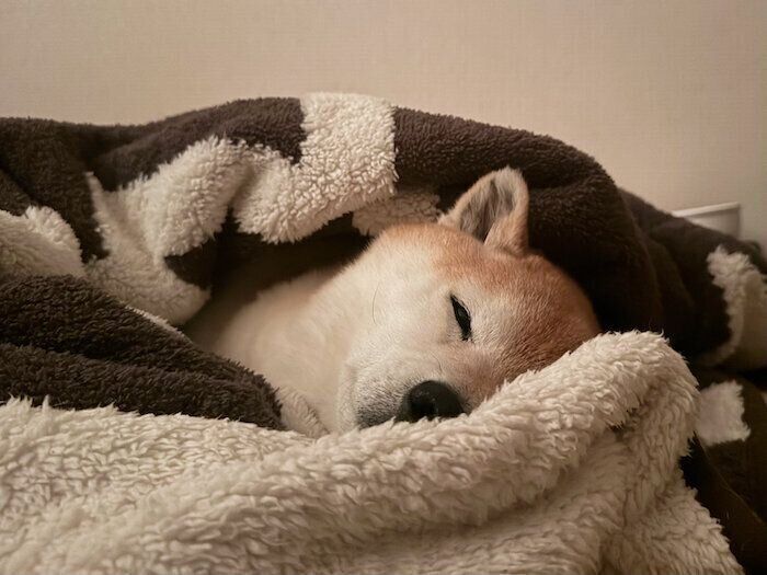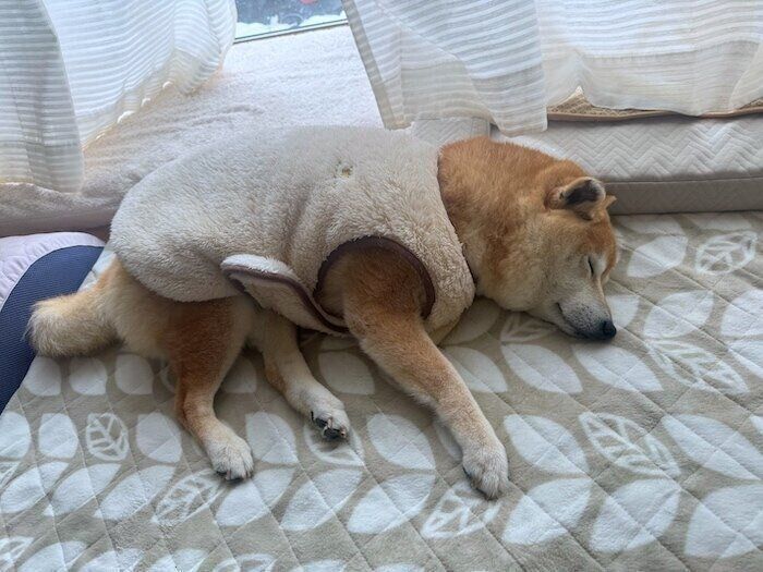 家に戻ると私もマロたんもようやくほっと一息。冷えた体をあたためるために「着る毛布」を着せると、まるでスイッチが切れたみたいにすぐに眠ってしまいました。さっきまであんなに険しい顔していたのが嘘みたいですね。