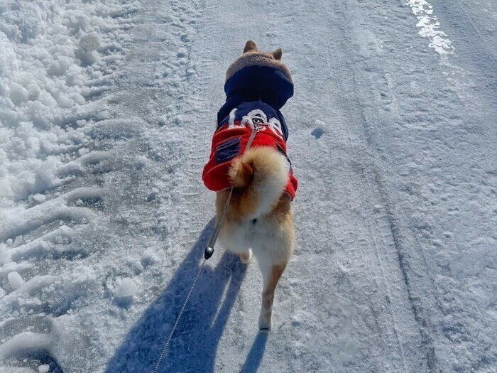 散歩に出ると雪のピークは越えて青空。路面はツルツルに凍っていましたが、そんなことはお構いなし。マロたんはるんるんでお通じ問題も解決。一方、リードを持つわたしは転ばないように必死で、内心はずっとドキドキでした。…これは毎年のことですが。