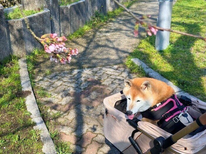 ですが、元気に復活したマロたんと今年もお散歩がてらのお花見をすることができました。とはいえ15歳。人の多い桜並木をゆっくり歩くのは少し大変かもしれないと思い、マロたんにはカートに乗ってもらうことに。これが大正解!とっても楽しそうにニコニコしています。